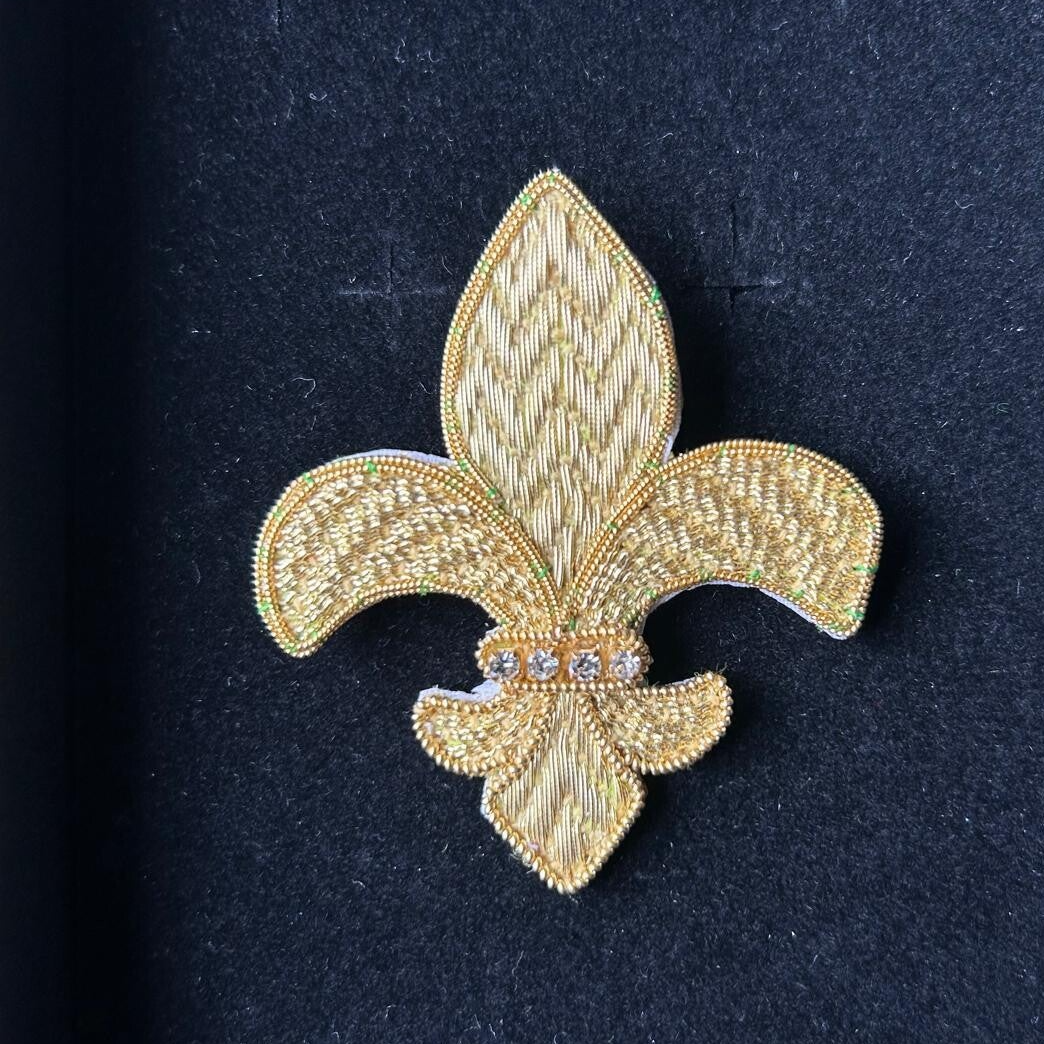 Conjunto de broche y pendientes bordados a mano. Realizado con hilo y lentejuelas de oro. Disponibilidad en varios colores.