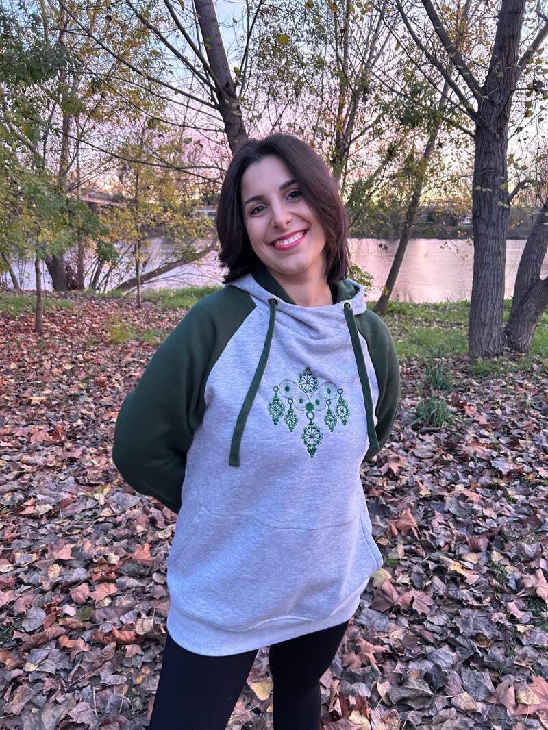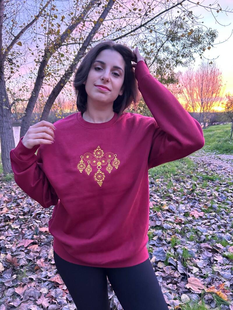 Sudadera bordada con el diseño de la tembladera característico de los aderezos de folklore. Disponible en varios colores.